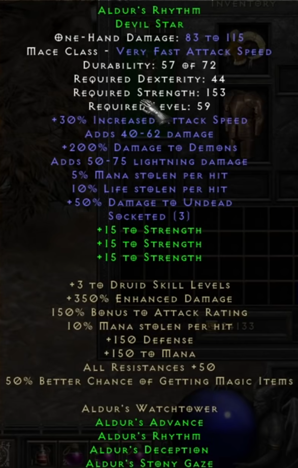 Aldur's Rhythm is probably the one we are most looking forward to upgrading Aldur's set, in particular the weapon. It makes the mediocre weapon at least semi-competent at least as far as options go until you're able to get something like grief or an endgame weapon, especially if you get a three socket version to use to your advantage since with three sockets, you can do everything from reaching higher attack speed breakpoints to reducing enemy defense significantly with emeralds or even just going leech or more elemental damage with some of the fairly common runes. And while it does not seem like a ton that little bit of a boost to base damage can be magnified quite a bit with the right setup.