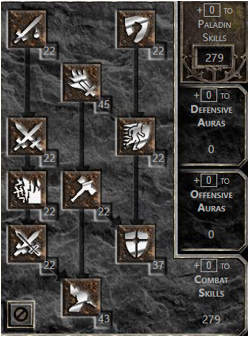 Sacrifice 22, Smite 22, Holy Bolt 45, Zeal 22, Charge 22, Blessed Hammer 22, Vengeance 22, Conversion 22, Holy Shield 37, Fist of the Heavens 43.