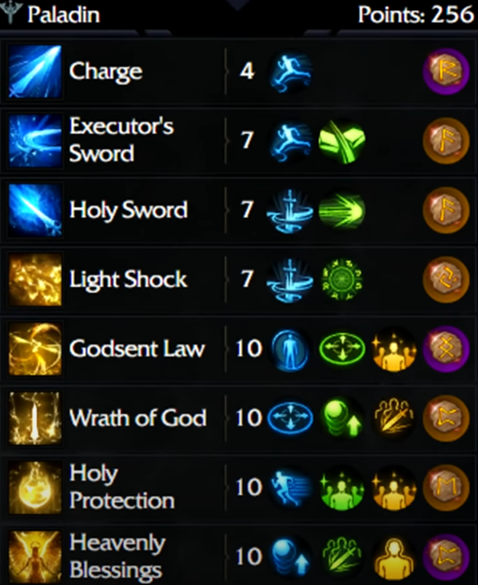 If you have played this class while leveling, you will be very familiar with the skills. The support build for the paladin class is built around providing teammates, shields and damage reduction. So the Godsent and Law ability provide a 70% damage reduction buff on the targeted area. Then the Executor Sword and Holy Sword are the counter-attack skills that rapidly swing your sword dealing damage and launching the enemies in the air. The next two abilities called the Wrath of God and Heavenly Blessings are simple damage spells, that not only inflict damage to the enemy but most importantly, each kill will give your nearby teammates a 15% attack power. But remember that these abilities don't stack. So for the most efficiency, use the other build after the first one has run out. Then for one of the last abilities, we have the Light Shock and this will do damage to the enemy and most importantly after using the skill, you will get an entire party member, 10% of real damage and this ability has such a low cooldown that you can have this buff active at all time. The charge ability is a simple damage and gap closing skill that makes your character charge 6 meters. The Holy Protection will give all of your members a shield for 11 of maximum hp and when the shield gets deactivated you get plus 8 of your hp. And then lastly the awakening skill is called the Alertnes’s Judgment and this will do big damage to the enemies while at the same time creating a barrier for 80% of your maximum hp, for all of your party members in a 24-meter radius. So use the skill when you and your teammates are super low health.